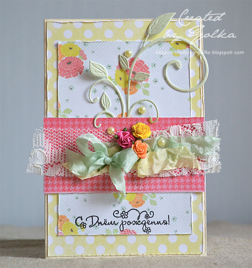 Бумажка, цветочки, брадс - всё KaiserCraft. Штампик от студии "Елена", кружево, которого не видно, бусинки, рафия
